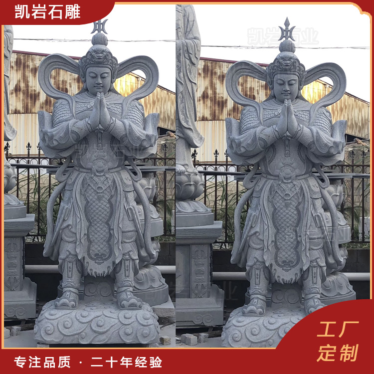 在寺庙中,石雕韦陀通常被塑造成身穿铠甲、手持...