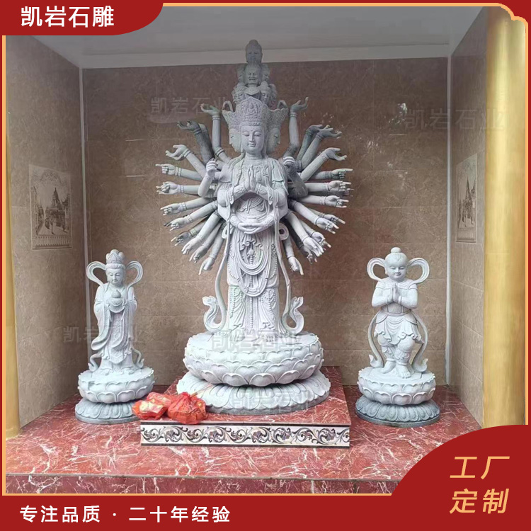 石雕千手观音是一种融合了宗教信仰与艺术工艺的作品。她的形象通常描绘为千手千眼,手持各种法器,象征着无尽的慈悲与智慧。石雕千手观音的形象在中国佛教艺术中具有极高的地位,不仅体现了佛教教义的核心价值,更是中国传统艺术的瑰宝。