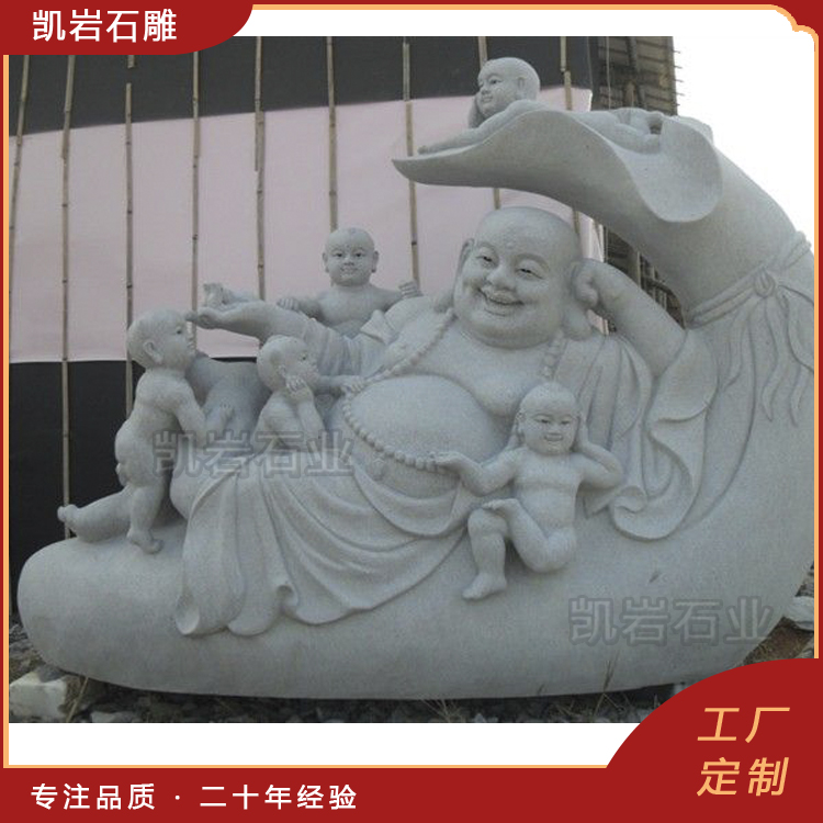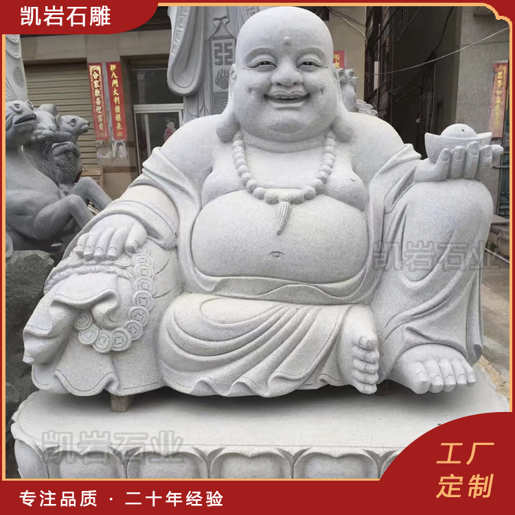 石雕弥勒佛作为佛教文化的重要象征,常常出现在寺庙、公共场所以及文化景区中。其形象通常被描绘为和蔼慈祥,给人以安宁、慈悲之感。以下是一些石雕弥勒佛图片,供大家欣赏。 石雕弥勒佛是采用天然石材雕刻而成,其样式十分丰富,有佛珠弥勒佛、五子戏弥勒、如意弥勒佛、元宝弥勒佛等造型。每一尊石雕弥勒佛都承载着信徒们对智慧、慈悲和祥和的向往,也是他们心灵寄托的具体体现。