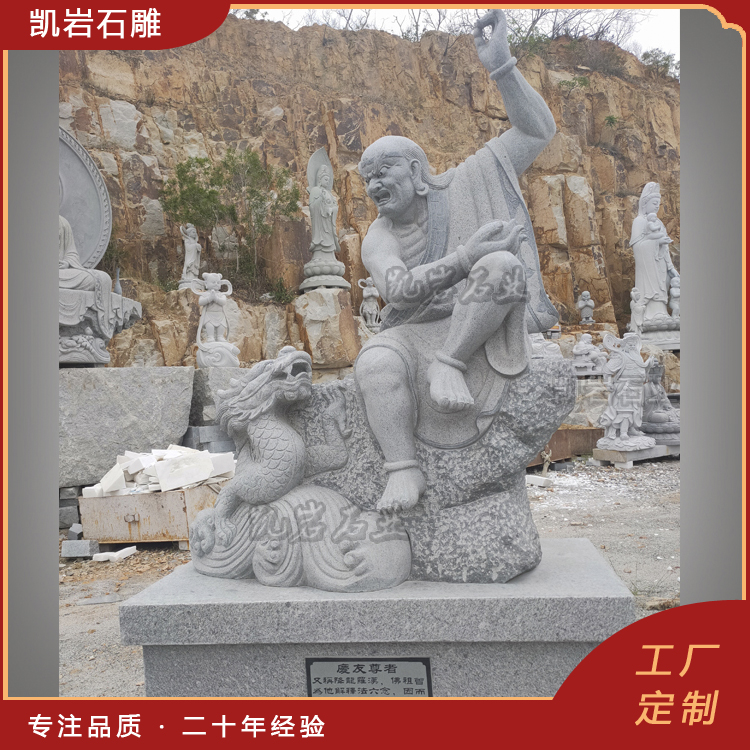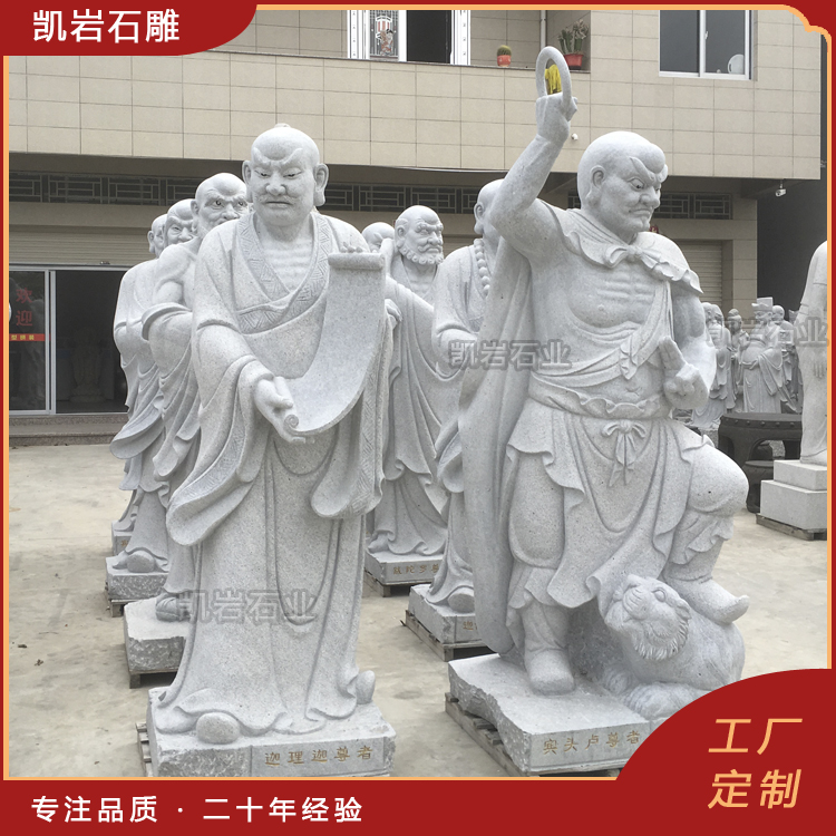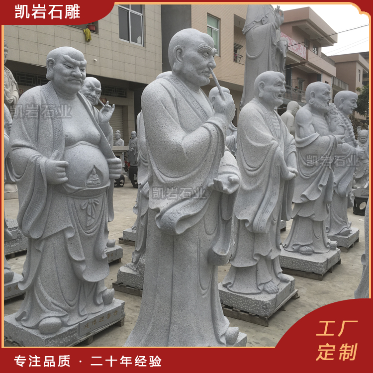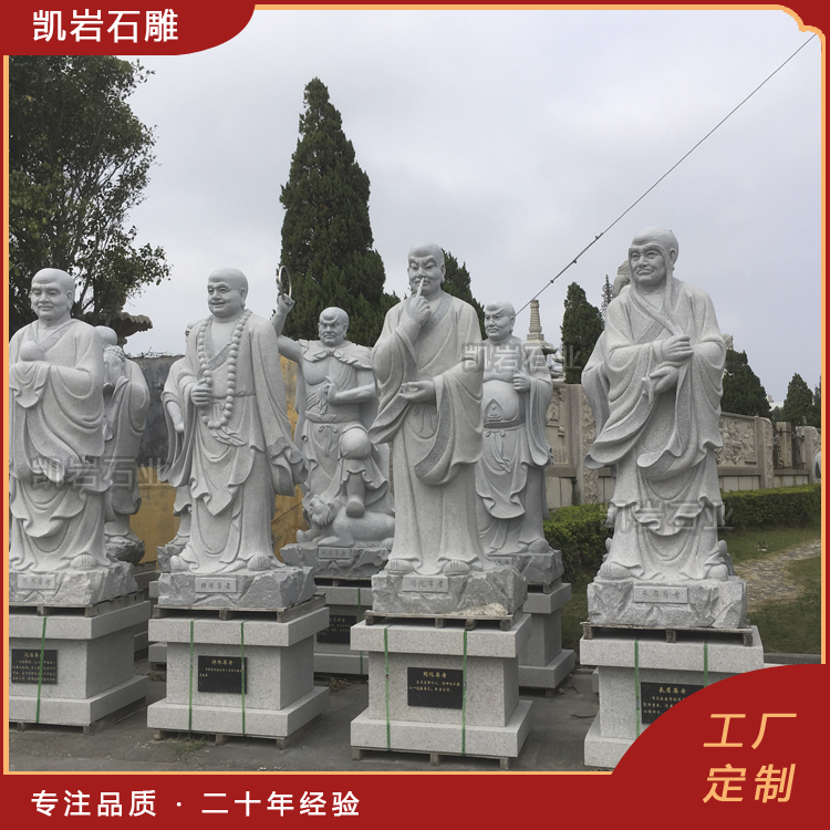 石雕十八罗汉作为佛教雕塑的一种,以其独特的艺术魅力和深刻的文化内涵,成为石雕艺术中的精品。每一尊罗汉雕像不仅是宗教信仰的象征,更是艺术家心血的结晶。 泉州凯岩石业制作的石雕十八罗汉,采用优质的石质精雕细琢而成,善用千年文化雕凿工艺的研究、传承、融合和发扬,使石雕作品承载艺术文化、体现更多社会价值。