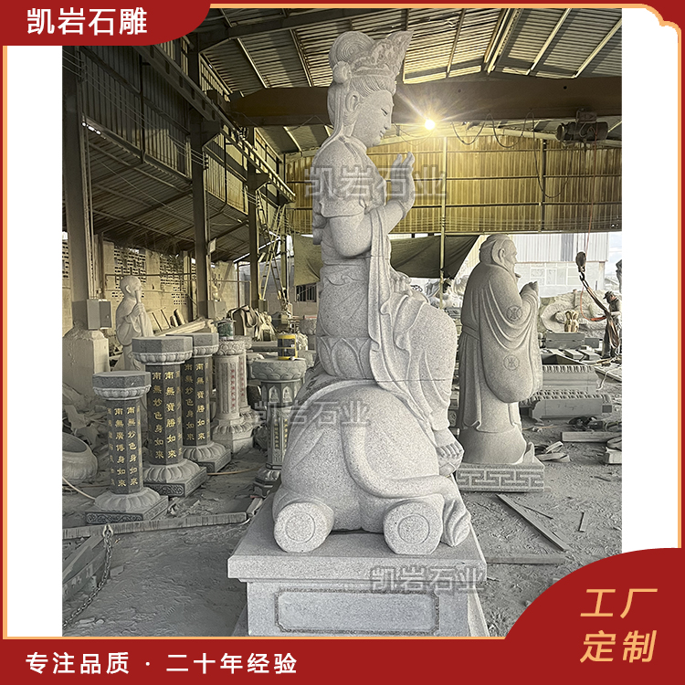 这类造像多用于寺院殿堂、文化景观,小型精品可作佛堂供奉,既承载祈福寓意,更是闽南传统石雕技艺与佛教文化融合的典范,见证了无数的悲欢离合,也承载了人们对美好生活的向往与追求。它们如同一部部生动的历史教科书,诉说着佛教文化的传承与发展,也激励着人们不断前行,追求更高尚的精神境界。 泉州凯岩石业制作的石雕文殊普贤菩萨,采用优质的石质精雕细琢而成,善用千年文化雕凿工艺的研究、传承、融合和发扬,使石雕作品承载艺术文化、体现更多社会价值。 【相关阅读】
