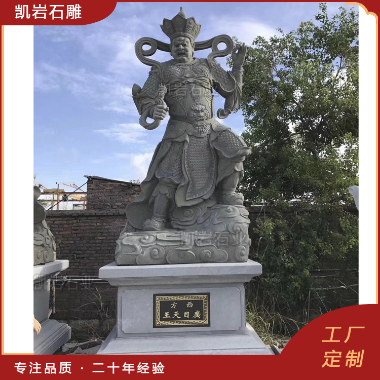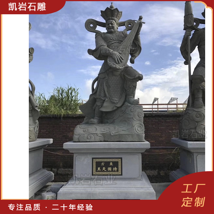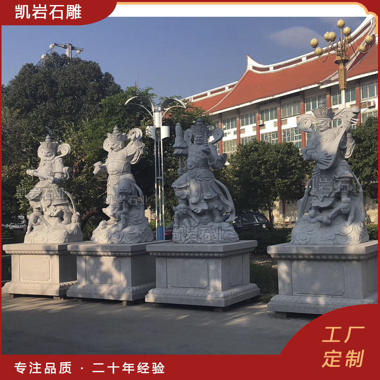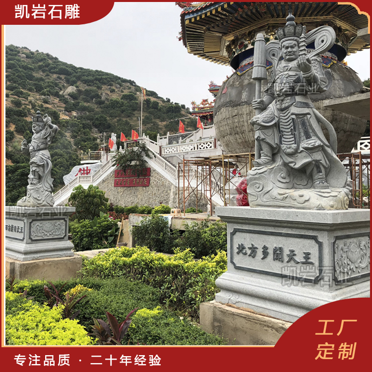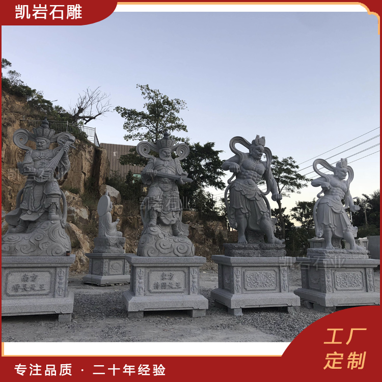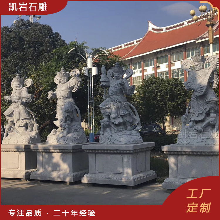 石雕四大天王雕像在寺院的天王殿中尤为常见,他们通常被塑造为高大而威猛的形象,四大天王,是佛教中守护四个方位的众神,分别为持国天王、增长天王、广目天王和多闻天王。石雕四大天王,作为佛教中的四大护法神,代表着风、调、雨、顺四种自然力量。