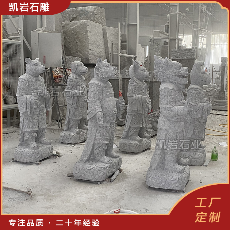 完整的石雕十二生肖兽首人身,多为整石圆雕,兽首传神生动,人身着广袖长袍、端庄而立,既保留动物灵性,又具人的威仪,是 “天人合一” 理念最直观的石刻表达。选材上,常用花岗岩、汉白玉、青石等耐风化石材,兼顾硬度与质感。