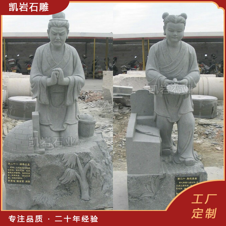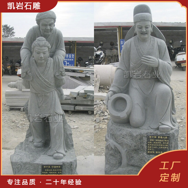 石雕二十四孝广泛应用于校园德育、社区文化建设、景区文化展示等场景,让人们在欣赏石雕艺术之美的同时,潜移默化地接受孝道文化的熏陶,孝心、孝行、孝悌等美德触动了无数人的心灵,让千年孝道精神在石头上延续,在当代焕发出新的生命力。 泉州凯岩石业制作的石雕二十四孝,采用优质的石质精雕细琢而成,善用千年文化雕凿工艺的研究、传承、融合和发扬,使石雕作品承载艺术文化、体现更多社会价值。 【相关阅读】