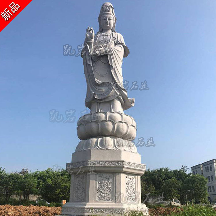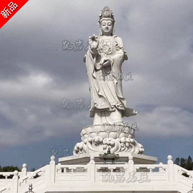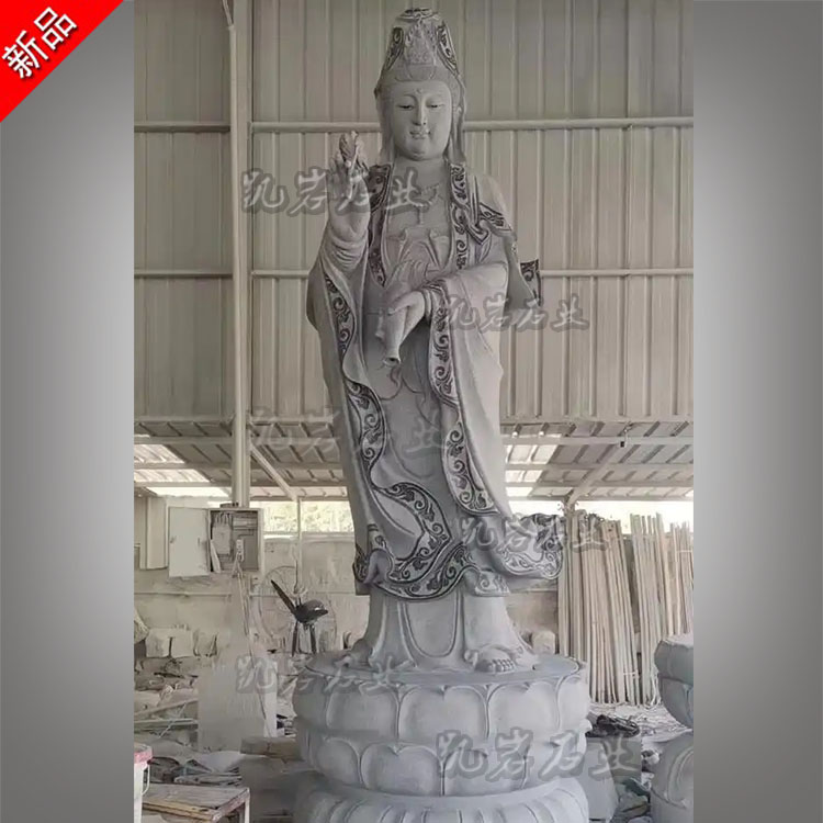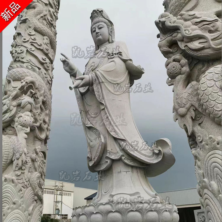 石雕滴水观音菩萨是佛教艺术中十分常见的一种佛像雕塑,其造型独特且寓意吉祥,常见的石雕滴水观音菩萨像造型优雅而庄重,她通常以婀娜的站姿呈现,观音菩萨身姿挺拔,线条流畅;其面容慈祥而宁静,一双半闭半睁的莲眼俯视着众生,仿佛在倾听众生的疾苦。