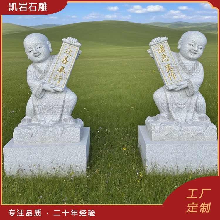 石雕小沙弥,在佛教中,原指那些出家修行但尚未满足某些条件的年轻男性僧侣。然而,在石雕艺术中,他们被赋予了全新的生命和形态,以各种姿态呈现,仿佛在诉说着古老的故事。以下是一些石雕小沙弥图片,供大家欣赏。 石雕小沙弥常被摆放在寺庙、公园、景区等各种场所。常见造型有挑水、劈柴、扫地、采药、闭目养神、喝茶、打瞌睡等造型。这些石雕小沙弥,他们的面庞带着童真中的一丝超脱,仿佛透过微笑向世人展...