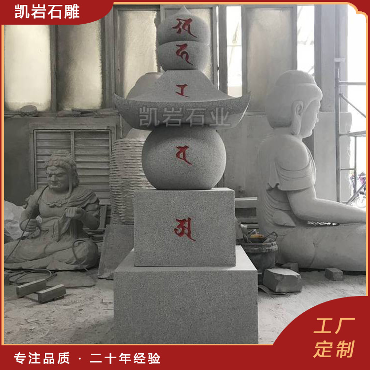 石雕五轮塔是一种具有独特艺术风格的佛教建筑,五轮塔的每一层都由不同的几何图形构成,包括正方形、圆形、三角形、半圆和圆点等,这些几何图形的组合不仅展示了艺术的美感,也反映了深远的哲学思想。 石雕五轮塔通常采用天然石材雕刻而成,通过雕刻不同方位的佛像,来展示他们各自的形态,镇守一方,福佑一路,体现了佛教中保护和祝福的寓意,也可以雕刻简单的梵文代替。这种石雕塔不仅是一种艺术品,更是佛教...