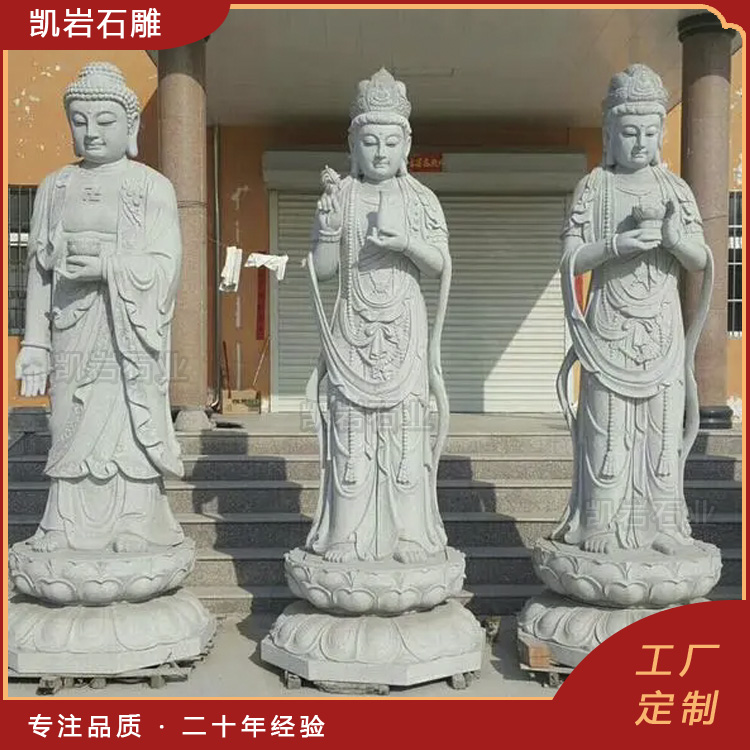 石雕西方三圣,又称阿弥陀三尊,是佛教石雕中极为经典的造像题材,由阿弥陀佛、观世音菩萨与大势至菩萨三位圣者组成。 作为石雕造像,西方三圣的布局有着严格的讲究——中尊居中,左右胁侍对称排布,主次分明、庄严肃穆,既符合佛教的仪轨规范,也契合中国传统美学中的对称之美。无论是大型寺庙的户外造像,还是小型殿堂的供奉摆件,这种布局始终未变,传递出一种稳定、祥和的信仰力量。 ...