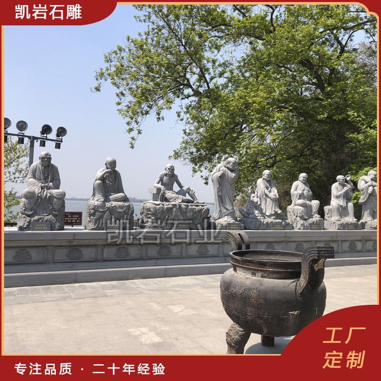 石雕十八罗汉是佛教艺术中的经典石雕题材,通常以坐像或立像形式呈现,形态各异。石雕十八罗汉常被放置在寺庙、佛堂等宗教场所,作为供奉和朝拜的对象。 也有一些会被放置在园林、庭院等场所,作为装饰性的艺术品,为环境增添文化氛围。