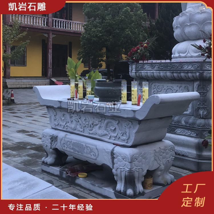 石雕供桌不仅是一件实用的器物,更是承载着传统文化与艺术价值的瑰宝。石雕供桌常见于寺庙、祠堂、佛寺等宗教场所,用于摆放香烛、供品等。也为这些神圣场所增添了庄重而神圣的氛围。以下是以下石雕供桌图片,供大家欣赏。