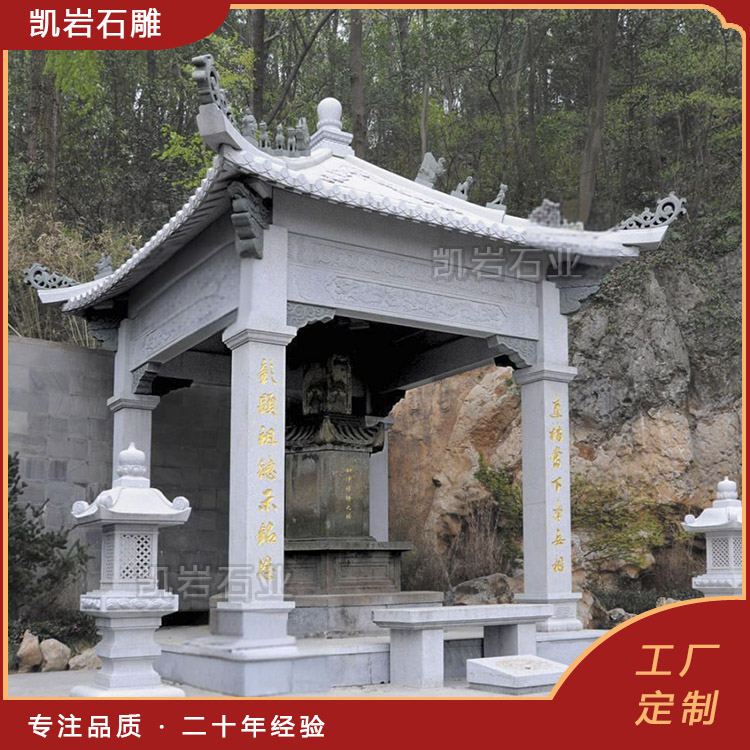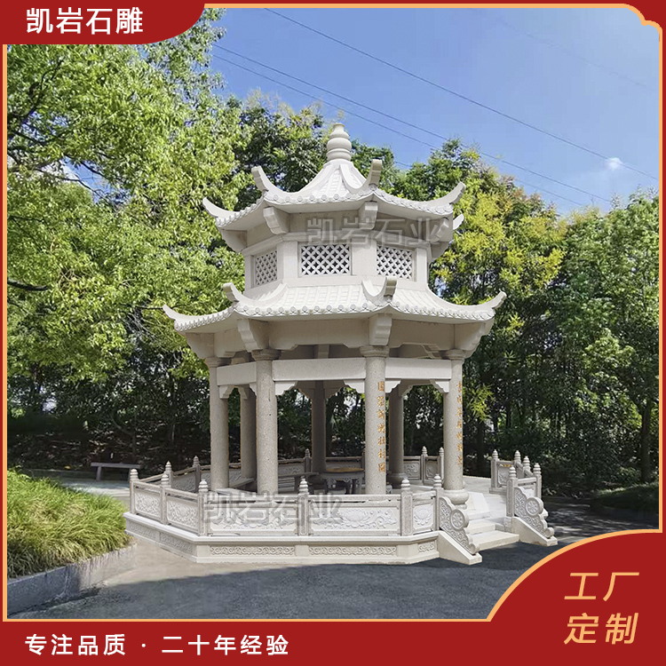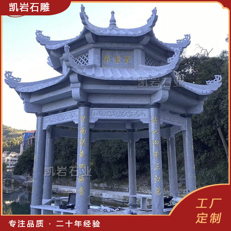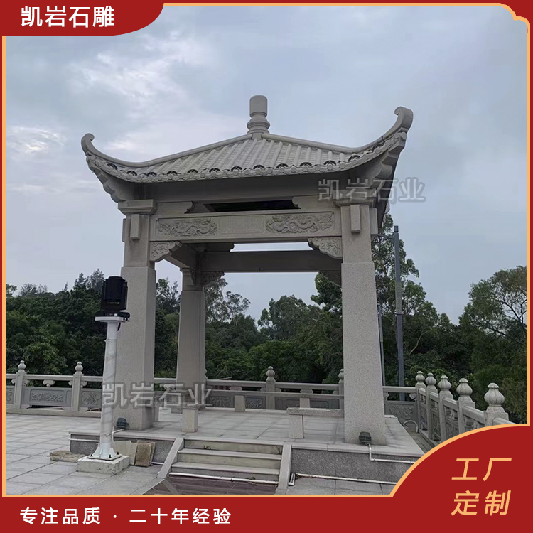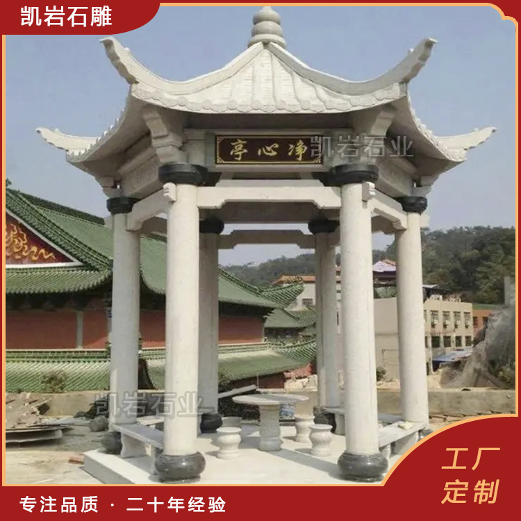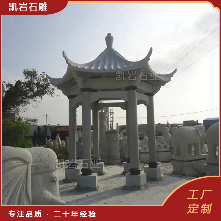 石雕四角亭子的四方形制,四方立柱象征着“四平八稳”,寄托着人们对安宁、顺遂的美好期许;飞檐翘角向上舒展,既似雄鹰展翅,又暗含“扶摇直上”的吉祥寓意,同时呼应中式建筑“天人合一”的理念,将自然之美与人文之韵完美融合。 泉州凯岩石业制作的石雕四角亭子,采用优质的石质精雕细琢而成,善用千年文化雕凿工艺的研究、传承、融合和发扬,使石雕作品承载艺术文化、体现更多社会价值。 【相关阅读】