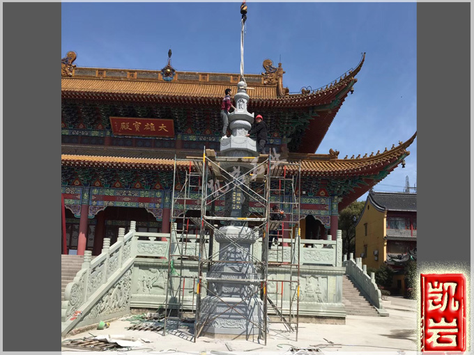 ![]() 凯岩石业制作的8米石经幢雕刻2019年3月28日安装于江苏大雄宝殿。 石幢也叫经幢,寺庙雕刻经幢一般有圆柱形、六角形和八角形。由基座、幢身和幢顶三部分组成,幢身刻陀罗尼经文,基座和幢顶则雕饰花卉、云纹以及佛、菩萨像。指刻有经文之多角形石柱,又名石幢。有二层、三层、四层、六层之分。形式有四角、六角或八角形。其中,以八角形为最多。 我厂制作的这两套就是以八角的形式来雕刻。