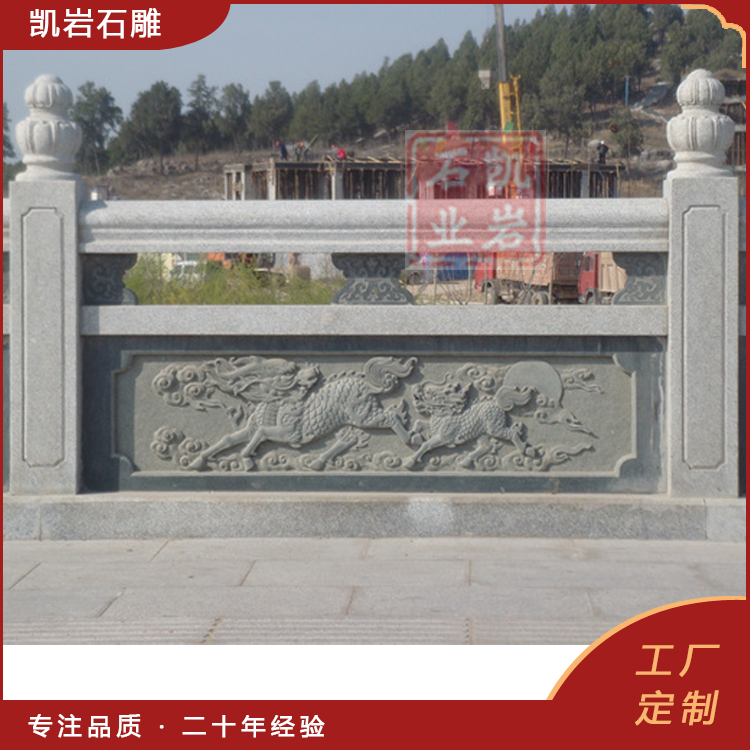 石雕栏杆,一般我们分为中式风格,欧式风格。一般中式风格相对比较古朴和老旧,雕龙刻凤,狮子大象麒麟貔貅,竹菊梅兰等等这些的都是中式风格。一般常见的地方会是在宗祠祖庙里,也适合该地方的建筑特色。欧式风格的栏杆相对比较好认,基本上欧式的统一带着罗马柱,这是欧式栏常见的风格。而这种石雕栏杆一般会用于别墅型的房屋建筑,因为是现代化建筑,因此这类的石雕栏杆相对会比较简约,没有太多的雕刻内容。 泉州凯岩石业制作的石雕栏杆,采用优质的石质精雕细琢而成,善用千年文化雕凿工艺的研究、传承、融合和发扬,使石雕作品承载艺术文化、体现更多社会价值。 【相关产品】