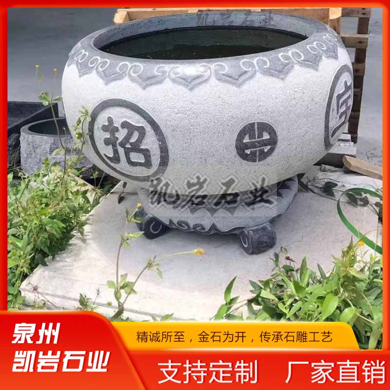 石雕聚宝盆,是中国古代民间传说中的宝物。传说明初沈万三致富原因是由于拥有聚宝盆。这个典故来自于周人龙的《挑灯集异》:“明初沈万三微时,见渔翁持青蛙百余,将事锉剞,以镪买之,纵于池中。嗣后喧鸣达旦,贴耳不能寐,晨往驱之,见蛙俱环踞一瓦盆,异之,将归以为浣手器。万三妻偶遗一银钗于盆中,银钗盈满,不可数计,以钱银试之亦如是,由是财雄天下。 石雕聚宝盆是财神宝物,可招财,聚财。可放在房子中的财位上或者放在神案及明亮之处。盆内放上现代钱币或金条或金砖(黄铜的即可),有极强的催财旺财作用。 泉州凯岩石业制作的石雕聚宝盆,采用优质的石质精雕细琢而成,善用千年文化雕凿工艺的研究、传承、融合和发扬,使石雕作品承载艺术文化、体现更多社会价值。 【相关产品】
