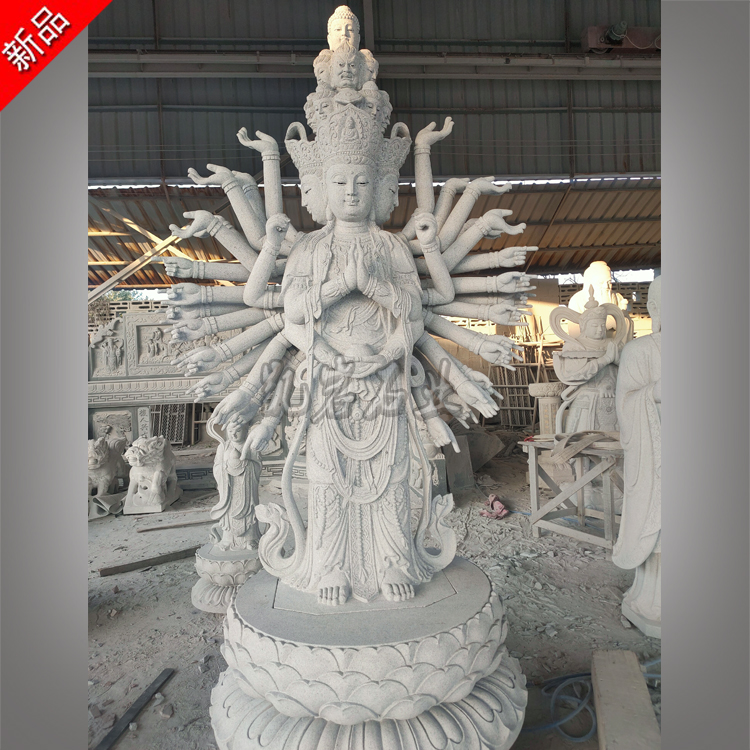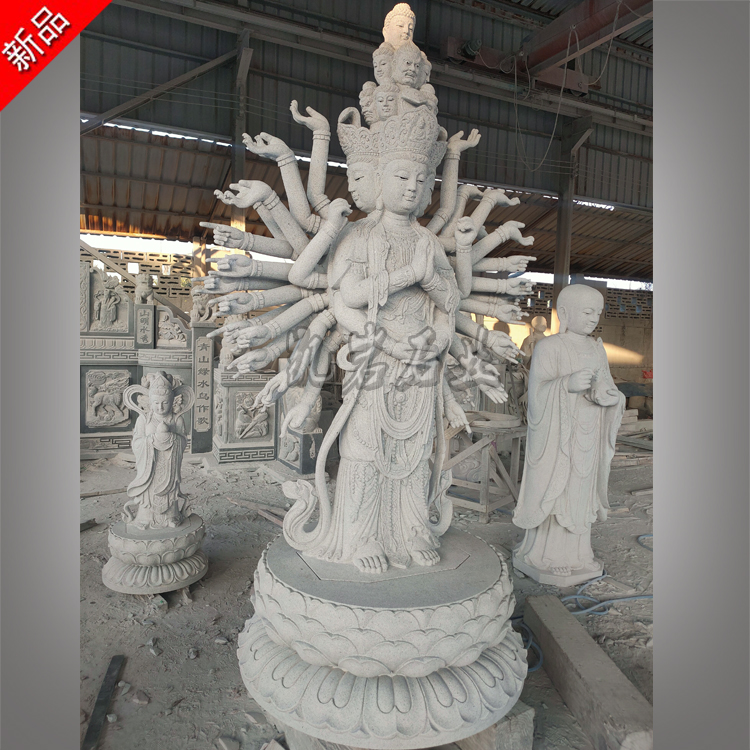 石雕千手观音,是我国民间信仰的四大菩萨之一,是大慈悲的象征。千手观音,最大的特色就是是她身后的手,以及手掌上的眼睛。中国历来都有千手观音的神话传说,相传,千手观音有一千只手、一千只眼睛,法力无边,在人世间普度众生。 据印度佛教典籍记载,千手观音菩萨的千手表示遍护众生,千眼则表示遍观世间。唐代以后,千手观音像在中国许多寺院中渐渐作为主像被供奉。石雕千手观音的形象,常以四十二手象征千手,每一手中各有一眼。 石雕千手观音,在雕刻上分别是圆雕、浮雕、圆雕浮雕相结合,不管是选择哪一种方式,呈现出来的千手观音都会有很好的视觉效果。可根据自己所需要摆放的场景环境去更好的选择适合的千手观音石雕像加工方式,最大化的展示摆放效果出来。 泉州凯岩石业制作的石雕千手观音,采用优质的石质精雕细琢而成,善用千年文化雕凿工艺的研究、传承、融合和发扬,使石雕作品承载艺术文化、体现更多社会价值。