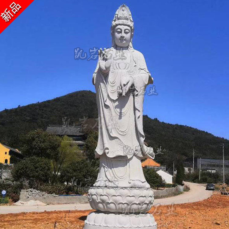 石雕滴水观音菩萨是佛教艺术中十分常见的一种佛像雕塑,其造型独特且寓意吉祥,常见的石雕滴水观音菩萨像造型优雅而庄重,她通常以婀娜的站姿呈现,观音菩萨身姿挺拔,线条流畅;其面容慈祥而宁静,一双半闭半睁的莲眼俯视着众生,仿佛在倾听众生的疾苦。