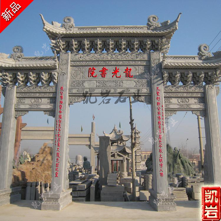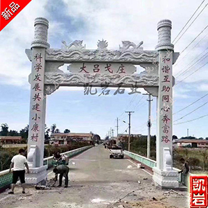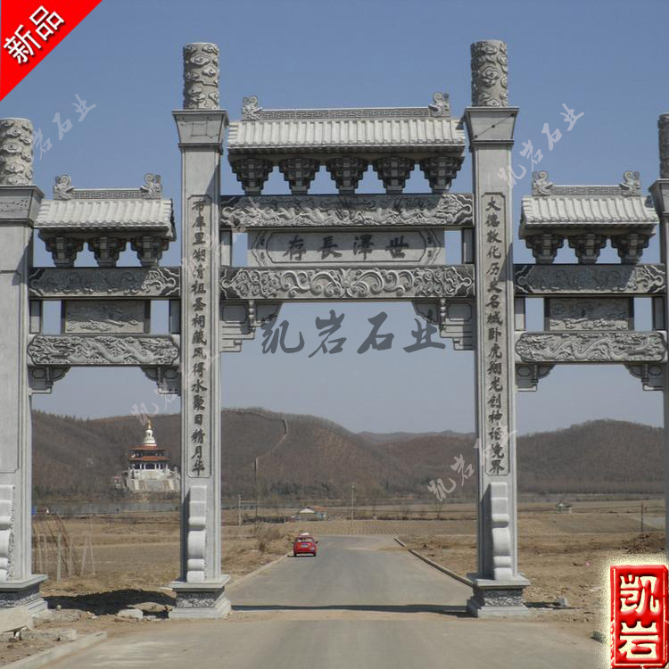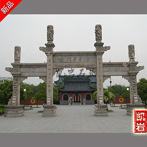 石雕牌坊,也叫石雕牌楼、石雕山门,汉族特色建筑文化之一。早见于周朝,初用于旌表节孝的纪念物,后来在村口街道、园林、寺观、宫苑和陵墓均有建造。石牌坊是汉族建筑文化中具有代表性的一种石质建筑,古时常用于表彰具有丰功伟绩的政要大员和民间具有一定功绩的重要人士。 石雕牌坊以景园、街道、村口前为多。从结构上看繁简不一,有的极简单,只有一间二柱,无明楼。复杂的有五间六柱十一楼者。由于本身的结构特点,有的虽为三间 四柱式,却只有花板而无明楼。石坊的明楼比较复杂,浮雕镂刻亦极有特色。如果石质坚细,不仅浮雕生动,而且其精细的图案历经数百年也不泯没。 石雕牌坊不仅建筑结构自成一格,别具风采,而且集雕刻、绘画、匾联文辞和书法等多种艺术于一身,熔古人的社会生活理念、封建礼教、封建传统道德观念、古代的民风民俗于一炉,具有瑰丽的艺术魅力、很高的审美价值和丰富而深刻的历史文化内涵。 泉州凯岩石业制作的石雕牌坊,采用优质的石质精雕细琢而成,善用千年文化雕凿工艺的研究、传承、融合和发扬,使石雕作品承载艺术文化、体现更多社会价值。