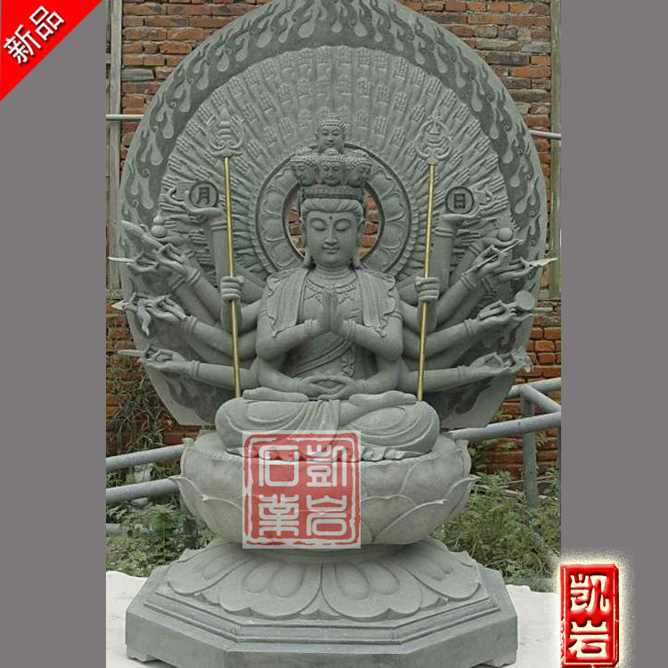 石雕千手观音被人称为千手千眼观音,也被人称为千目观音,造型主要是观音的左右手都有很多,一般来说,佛教中用42支数来代替千,所以,人们在加工千手观音的时候一般左右手各21只手,然后每只手的手心有一只眼睛,并且眼睛所看到的方位要不一样,这是观音比较特殊的造像,特别是唐朝以后,这种千手观音是为数不多留下来的比较偏藏传佛教的观音造型。这样的观音的作品主要体现的是观音不同手的不同形态,然后结合手心中的眼睛,让观音可以观察到不同方向不同角度的不同的地方,但是双手的角度和形状要保持一样的,就是说千手观音的左右手42之手要对称并且看向不同的地方。 泉州凯岩石业制作的石雕千手观音,采用优质的石质精雕细琢而成,善用千年文化雕凿工艺的研究、传承、融合和发扬,使石雕作品承载艺术文化、体现更多社会价值。 【相关产品】