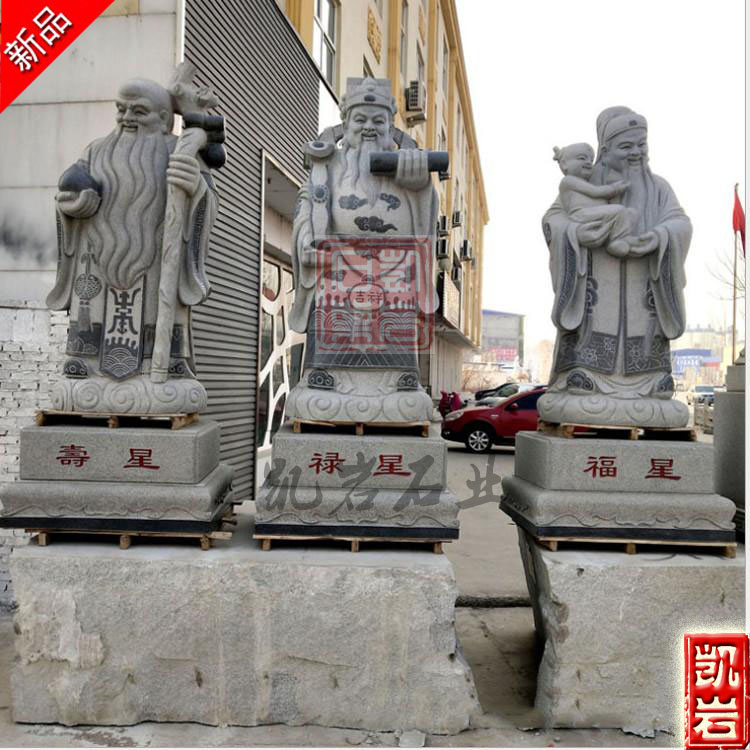 石雕福禄寿是中国民间信仰的三位神仙,象征幸福、吉利、长寿。在道教流传为天上三位吉神。福星,头戴官帽手持玉如意或手捧小孩为天官一品大帝,天官赐福由此而来;禄星,手捧如意寓意高官厚禄(因被中国民间扭曲影像,所以现在的禄神都变成捧小孩的);寿,白色的胡髭,手持龙头杖手捧寿桃意为长命百岁。 "福星"又称"福神",在道教中称"紫微大帝",他掌管人间福气的分配,在民间相当受尊崇。他的形象与财神赵公明有些像,是天庭饱满、地格方圆的富贵相。这位福神据说由唐代道州(今湖南道县〉剌史阳城死后担任。 "禄星"又称"文昌星",他是读书人的保护神,掌管人间功名利禄。有了科举制度之后,他在民间开始备受尊崇。他的形象就像一位朝廷大员,高贵不凡。禄神据说由"梓潼神"张亚子担任,又称"文昌帝君"。 "寿星"又称"南极老人星",是长寿之神。人们大多认为长寿的彭祖死后成为了"寿星"。人们对"寿星"最直观的印象就是他有一个大额头,多数人认为这多半是古代养生术所营造的一种意象。例如,被古人视为长寿象征的丹顶鹤的头部便高高隆起。此外,也有人认为那是一种返老还童的象征,因为婴儿的额头往往因头发少而比较明显。 泉州凯岩石业制作的石雕福禄寿三星,采用优质的石质精雕细琢而成,善用千年文化雕凿工艺的研究、传承、融合和发扬,使石雕作品承载艺术文化、体现更多社会价值。