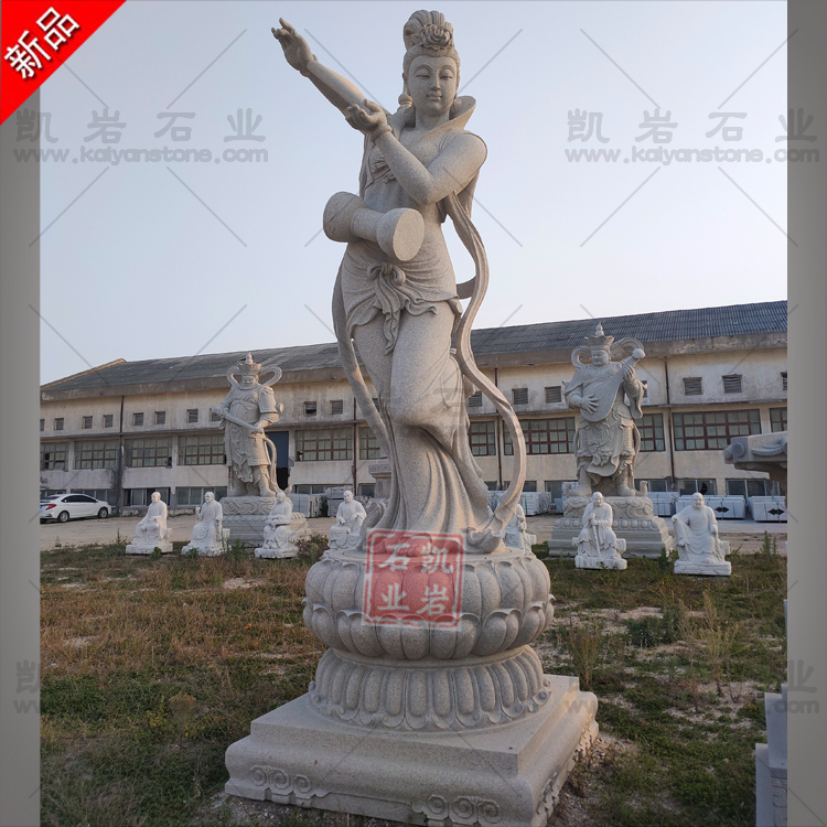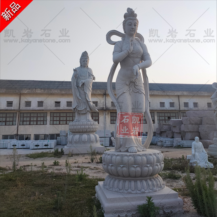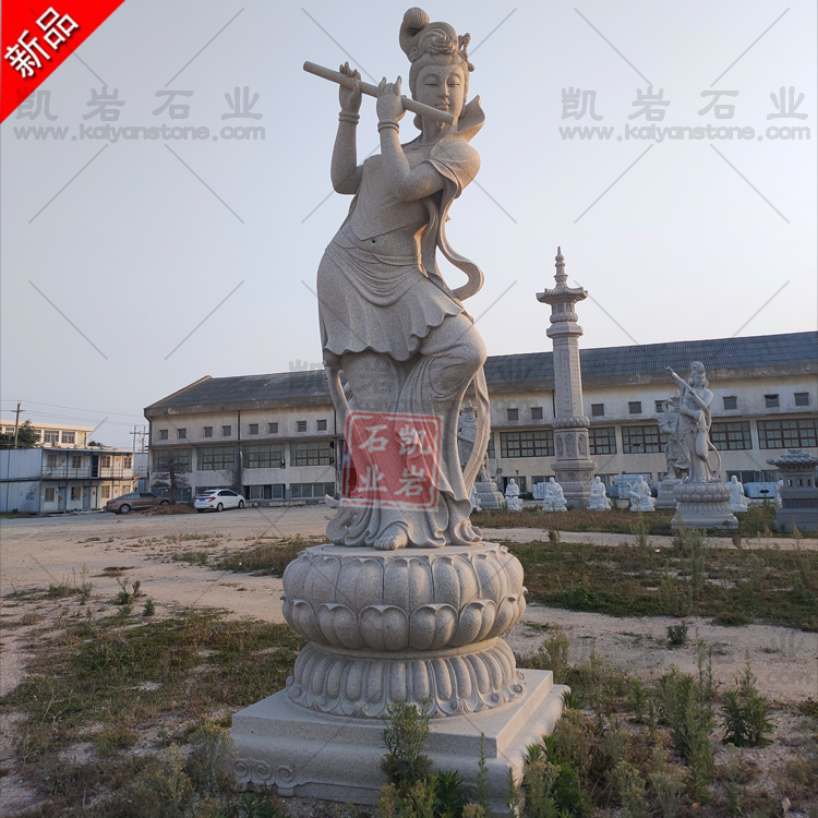 石雕飞天是天宫的精灵,在造型上集中了人间最善良、最美丽的形象,使人觉得亲切并产生护佑感。飞天的美学基调是健康的,表达的是飞舞、开朗、乐观的情趣,这也正是飞天艺术的生命力所在。敦煌飞天,经历了千余年的岁月,展示了不同的时代特色和民族风格,许多优美的形象,欢乐的境界,永恒的艺术生命力至今仍然吸引着人们。 泉州凯岩石业制作的石雕飞天仙女,采用优质的石质精雕细琢而成,善用千年文化雕凿工艺的研究、传承、融合和发扬,使石雕作品承载艺术文化、体现更多社会价值。
