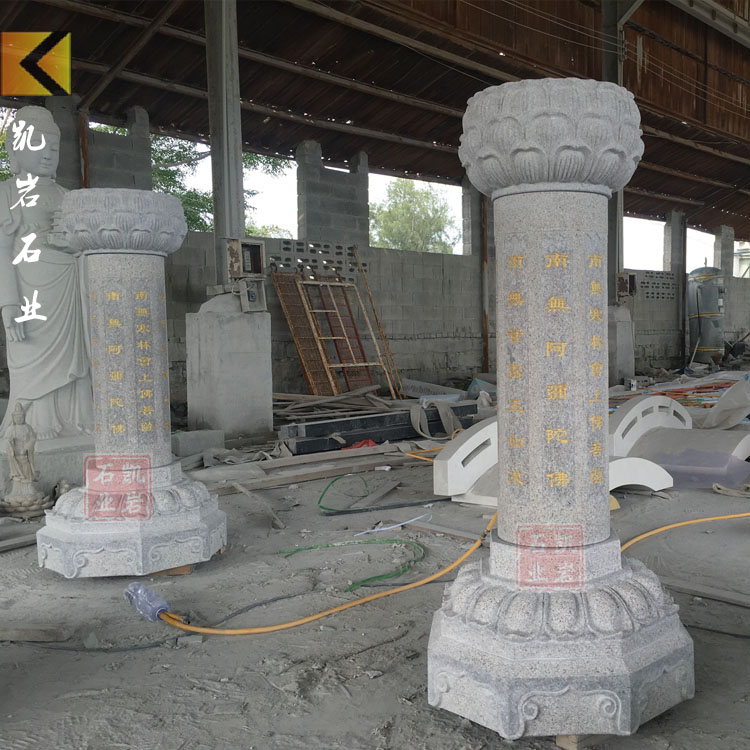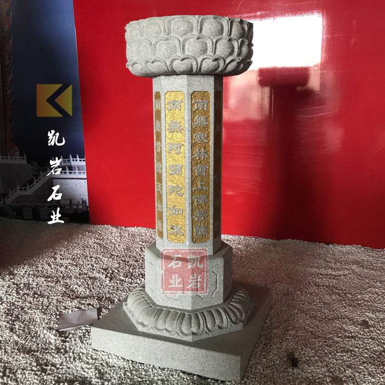 我们看到的出食台石雕一般规格在120CM到200CM之间,选用的材质大多数都是用优质的花岗岩,花岗岩的质地比较坚硬,经得起自然的风吹日晒。一般柱身都为八角型的,一面刻寺院的名字,另外七面刻七如来的名称。