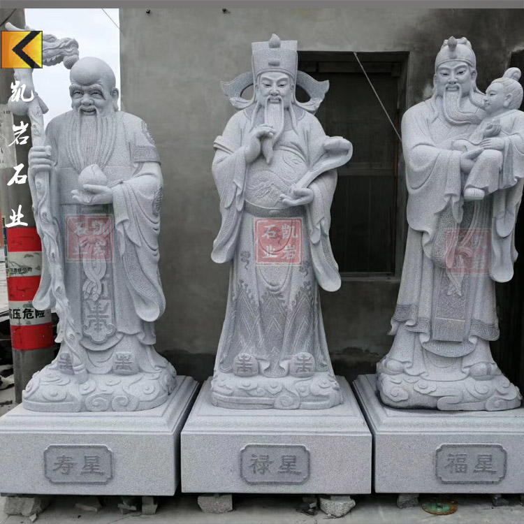 石雕福禄寿三星,福禄寿三星石雕,福禄寿石雕厂家,石雕福禄寿三星厂 福禄寿三星是起源于中国对远古的星辰自然崇拜。福星,禄星,寿星,古人按照自己的理解和感受,赋予他们非凡的神性和独特的人格魅力。这是属于中国人自己的信仰,他们在民间的影响力颇大,此三星属于道教神仙,道教是中国土生土长的宗教信仰,所以此三神也经常能够在寻常巷陌中看到,千家万户都供得有道教神明,福禄寿三神仙成为民间世俗生活理想的真实写照。常见福星手拿一个“福”字,禄星捧着金元宝,寿星托着寿桃、拄着拐杖。另外还有一种象征画法,画上蝙蝠、梅花鹿、寿桃,用它们的谐音来表达福、禄、寿的含义。
