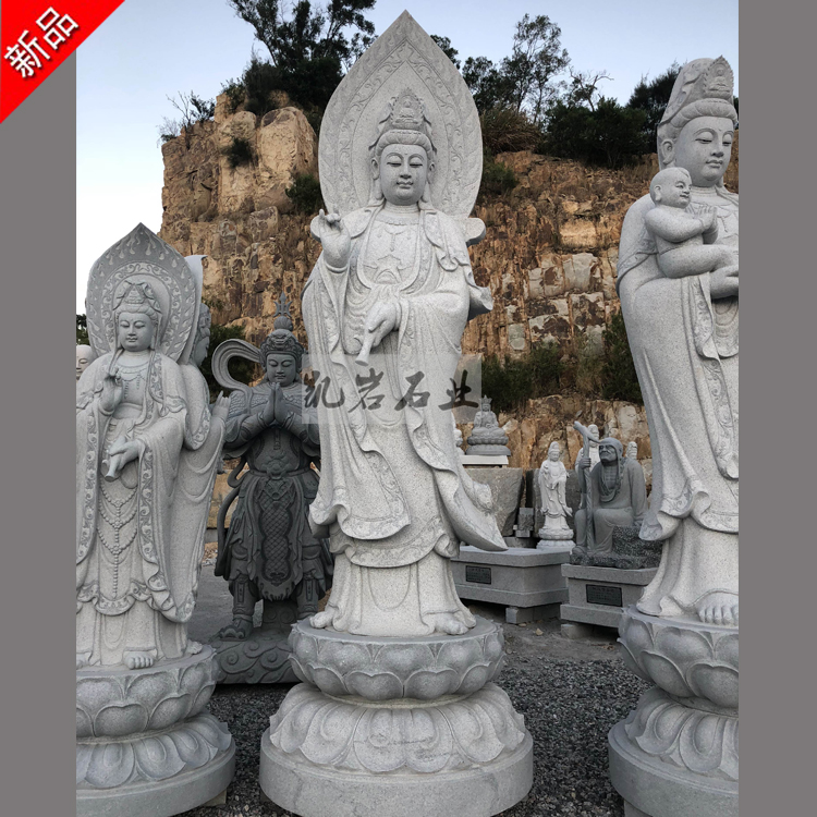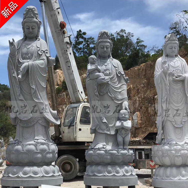 现如今人们的生活水平逐渐提高,有越来越多的人开始信佛向善,石雕滴水观音也越来越受到了人们的崇敬与信奉,许多的善男信女都供奉滴水观音像,以求得自己的一生平安。“滴水”,寓意细水长流,宝贵不断头。“观音”又称“观世音”,佛教菩萨名。慈悲的化身,救苦救难之神。“石雕滴水观音”,寓意观音赐福,好运连连,宝贵长久。 泉州凯岩石雕厂常年加工的佛像雕塑之一,其造型多种多样,有站姿、坐姿、还有卧姿。采用天然花岗岩芝麻白石材加工制作的观音菩萨像,可以在室内外放置长达成百上千年之久。