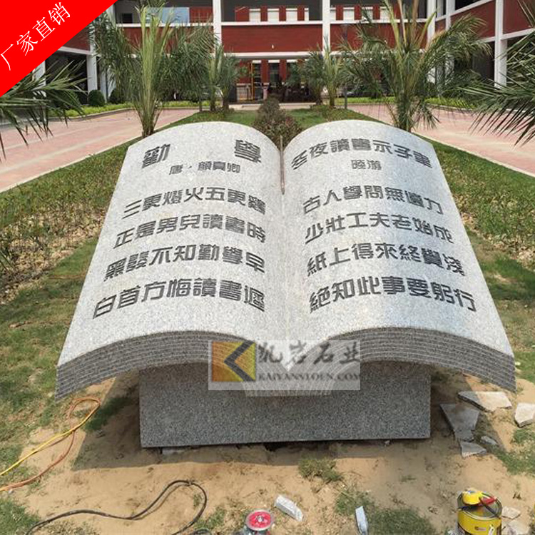 石雕书本主要是用于学校绿地的装修和美化。由于它的呈现而使学校的景观添加,丰厚了青少年的精力享用。学校是培育学生的好基地,是人才培育的基地。学校石雕书本的表现形式比较的多样化,其摆放位置也是需求斟酌的,它的摆放位置要跟周围的环境协调一致。这样才能更好地发挥其效果。石雕书本不仅仅是一种装修物更是一种文化精力的象征。 校园书本雕塑,励志刻字书这种物化了的精神载体,它集中反映了校园这个特定群体的品德价值观和审美取向,是进行品德教育、审美教育的好的资料之一。石雕书本、竹简放在校园,不仅能够美化环境而且还能陶冶情操。书本能继承传达古人智慧,使咱们的虔诚源于我对时间短人生的了解,敬畏源于圣贤们悲悯苍生的仁慈,忠诚源于圣贤们思维的真挚,是他们赐予我一双洞穿苍茫的眼睛和一颗干净的心灵。读书能够正确、获悉、知礼,为作业建言献计,与朋友在一起谈天论地,让心胸旷达开朗等,都离不开书本,经过读书增加自己的才能、经过读书开阔自己的视野、经过读书进步本身的涵养。经过读书摆脱无知所带来的烦恼。 泉州凯岩石业制作的石雕书本,采用优质的石质精雕细琢而成,善用千年文化雕凿工艺的研究、传承、融合和发扬,使石雕作品承载艺术文化、体现更多社会价值。
