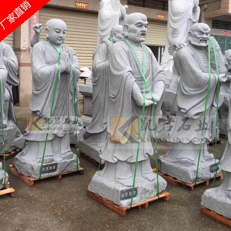 石雕十八罗汉是我们生活当中最为常见的雕塑品之一。人们常说的“十八罗汉”包括坐鹿罗汉、欢喜罗汉、举钵罗汉、托塔罗汉、静坐罗汉、过江罗汉、骑象罗汉、笑狮罗汉、开心罗汉、探手罗汉、沉思罗汉、挖耳罗汉、布袋罗汉、芭蕉罗汉、长眉罗汉、看门罗汉、降龙罗汉、伏虎罗汉诸罗汉。每个罗汉都有自己的特点。