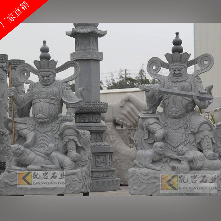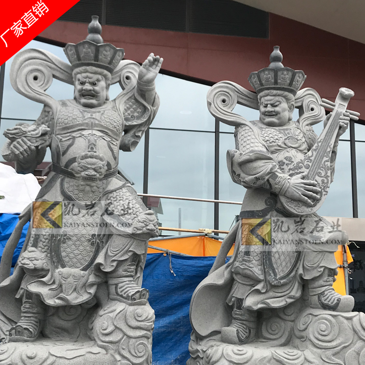 石雕四大天王居于须弥山山腰,各护一方。寺庙石雕四大天王的东方持国天王,梵语音译“提头赖咤”,即慈悲为怀,护持众生。手持琵琶,护东胜神洲。南方增长天王,梵语音译“毗娄勒”,即让众生增长善根,护持佛法。手提宝剑,护南瞻部洲。西方广目天王,梵语音译“毗娄博义”,即能以净天眼观世界、护人民。手持紫金龙索,护西牛贺洲。北方多闻天王,梵语音译“毗沙门”,即福德之名遍闻四方,持伞或拄长柄幡,护北俱芦洲。 泉州凯岩石业制作的石雕四大天王雕像,采用优质的石质精雕细琢而成,善用千年文化雕凿工艺的研究、传承、融合和发扬,使石雕作品承载艺术文化、体现更多社会价值。