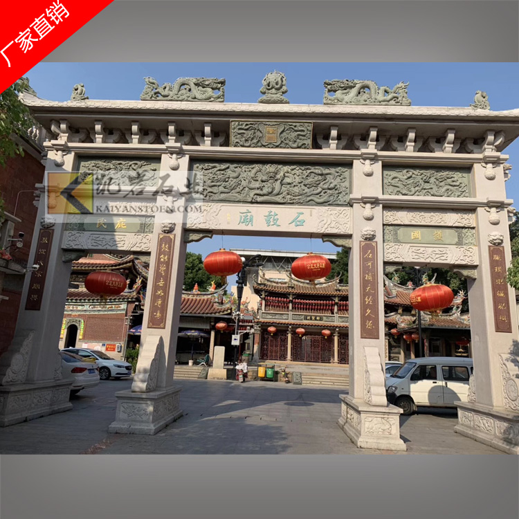 石雕牌坊以景园、街道、村口前为多。从结构上看繁简不一,有的极简单,只有一间二柱,无明楼。复杂的有五间六柱十一楼者。由于本身的结构特点,有的虽为三间 四柱式,却只有花板而无明楼。石坊的明楼比较复杂,浮雕镂刻亦极有特色。如果石质坚细,不仅浮雕生动,而且其精细的图案历经数百年也不泯没。 石雕牌坊不仅建筑结构自成一格,别具风采,而且集雕刻、绘画、匾联文辞和书法等多种艺术于一身,熔古人的社会生活理念、封建礼教、封建传统道德观念、古代的民风民俗于一炉,具有瑰丽的艺术魅力、很高的审美价值和丰富而深刻的历史文化内涵。 泉州凯岩石业制作的石雕山门牌楼、石雕牌坊,采用优质的石质精雕细琢而成,善用千年文化雕凿工艺的研究、传承、融合和发扬,使石雕作品承载艺术文化、体现更多社会价值。